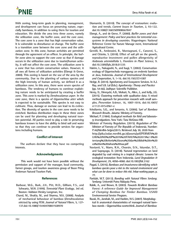 151 With zoning, long-term goals in planning, management, and development can focus on preserving nature, especially bamboos, in addition to using them for tourism and education. We divide the area into three zones, namely the utilization zone, the buffer zone, and the core zone. The core zone is a zone that has high conservation value. It is vulnerable to disturbance or change. The buffer zone is...