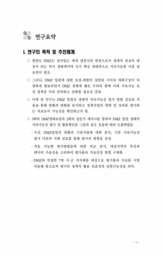 i 연구요약 I. 연구의 목적 및 추진체계 ○ 한반도 DMZ는 살아있는 세계 냉전사의 현장으로서 세계적 관심의 대 상이 되는 특이 생태계이며 국가 핵심 생태축으로 지속가능한 이용 및 보전이 필요. ○ 그러나, DMZ 일원에 대한 보전-개발의 상반된 시각과 계획구상이 다 양하게 발표되면서 DMZ 생태계 훼손 우려와 함께 미래 지속가능 보 전 정책을 미리 준비하고 강화할 필요성 증대. ○ 이에 본 연구는 DMZ 일원의 생태적 지속가능성 평가 방법 검토와 적 용을 통해 현황과 변화를 분석하고 정책사업의 영향 및 성과를 평가하 는 지표로서 가능성을 확인하고자 함. ○ 3회의 DMZ생태포럼과 2회의 전문가 세미나를 통하여 DMZ 일원 생태적 지속가능성 평가 및 활용방안을 그림과 같은 흐름에 따라 도출하였음. 우선, ...