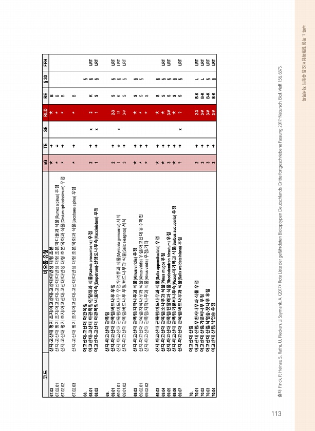 부록 1. 독일 절멸위험 비오톱 유형의 적색목록 출처Finck, P., Heinze, S., Raths, U., Riecken, U. Ssymank, A. 2017 Rote Liste der gef?hrdeten Biotoptypen Deutschlands. Dritte fortgeschriebene Fassung 2017.-Natursch. Biol. Vielf. 156, 637S. 코드 비오톱 유형 nG TE SE RLD RE § 30 FFH 67.02 산지-고산대 평지 초지/아고산대-고산대/다년생 대형 초본 ? ? ? B 67.02.01 산지-고산대 평지 초지/아고산대-고산대/다년생 대형 초본/마디풀과 식물 Rumex alpinus 우점 ? ? ? B 67.02.02 산지-고산대 평지 초지/아고산대-고...