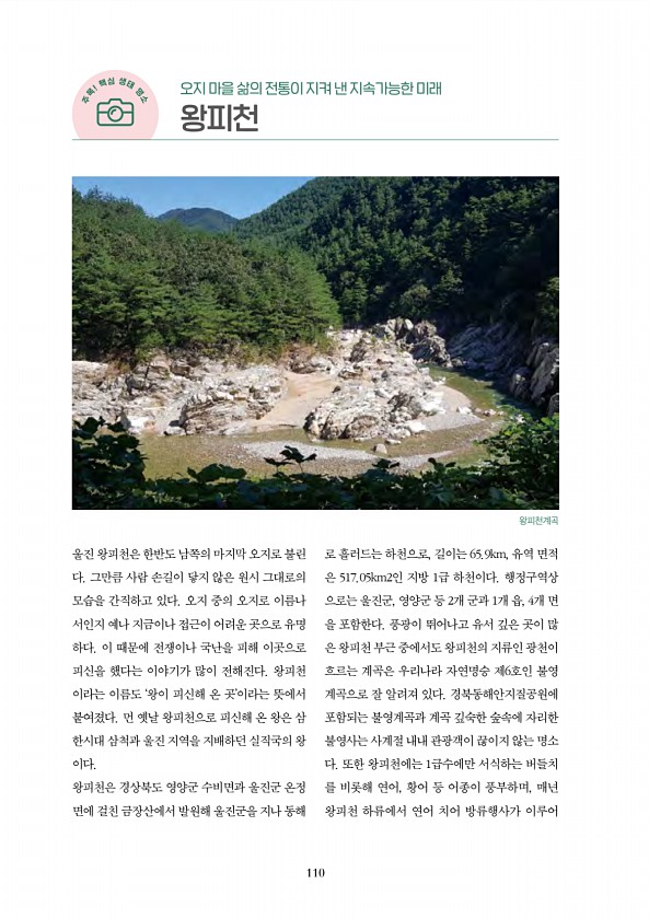 110 울진 왕피천은 한반도 남쪽의 마지막 오지로 불린 다. 그만큼 사람 손길이 닿지 않은 원시 그대로의 모습을 간직하고 있다. 오지 중의 오지로 이름나 서인지 예나 지금이나 접근이 어려운 곳으로 유명 하다. 이 때문에 전쟁이나 국난을 피해 이곳으로 피신을 했다는 이야기가 많이 전해진다. 왕피천 이라는 이름도 ‘왕이 피신해 온 곳’이라는 뜻에서 붙여졌다. 먼 옛날 왕피천으로 피신해 온 왕은 삼 한시대 삼척과 울진 지역을 지배하던 실직국의 왕 이다. 왕피천은 경상북도 영양군 수비면과 울진군 온정 면에 걸친 금장산에서 발원해 울진군을 지나 동해 로 흘러드는 하천으로, 길이는 65.9km, 유역 면적 은 517.05km2인 지방 1급 하천이다. 행정구역상 으로는 울진군, 영양군 등 2개 군과 1개 읍, 4개 면 ...