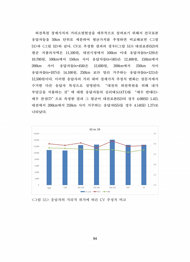 94 하천복원 경제가치의 거리소멸현상을 세부적으로 살펴보기 위해서 전국표본 응답자들을 50km 단위로 세분하여 평균가치를 추정하면 비교해보면 그림 51 과 그림 52 와 같다. CV로 추정한 결과의 경우 그림 51 대전표본 S2 의 평균 지불의사액은 11,100원, 대전시청에서 100km 이내 응답자들 n=129 은 10,700원, 100km에서 150km 사이 응답자들 n=185 은 12,400원, 150km에서 200km 사이 응답자들 n=458 은 12,600원, 200km에서 250km 사이 응답자들 n=107 은 14,100원, 250km 보다 멀리 거주하는 응답자들 n=121 은 12,500원이다. 이러한 응답자의 거리 대비 경제가치 추정치 변화는 설문지에서 수거한 다른 응답자 특성으로 설명된다....