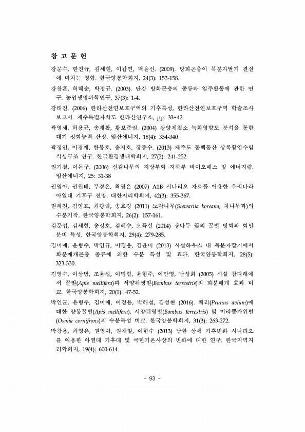 93 참 고 문 헌 강문수, 한진규, 김세현, 이갑연, 백을선. 2009 방화곤충이 복분자딸기 결실 에 미치는 영향. 한국양봉학회지, 24 3 153-158. 강창훈, 허혜순, 박정규. 2003 단감 방화곤충의 종류와 일주활동에 관한 연 구. 농업생명과학연구, 37 3 1-4. 강태진. 2006 한라산천연보호구역의 기후특성, 한라산천연보호구역 학술조사 보고서. 제주특별자치도 한라산연구소, pp. 3342. 곽영세, 허용균, 송재활, 황보준권. 2004 광양제철소 녹화영향도 분석을 통한 대기 정화능력 산정. 임산에너지, 18 4 334-340 곽정인, 이경재, 한봉호, 송지호, 장종수. 2013 제주도 동백동산 상록활엽수림 식생구조 연구. 한국환경생태학회지, 27 2 241-252 권기철, 이돈구. 2006 ...