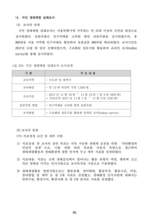 96 나. 국민 생태체험 실태조사 1 조사의 설계 국민 생태체험 실태조사는 서울특별시에 거주하는 만 15세 이상의 국민을 대상으로 실시하였다. 표본추출은 인구비례를 고려한 할당 표본추출을 실시하였으며, 총 900명을 서울 지역별 인구비례로 할당하여 유효표본 900부를 확보하였다. 조사기간은 2017년 11월 한 달간 진행되었으며, 구조화된 설문지를 활용하여 온라인 조사 online survey 를 통해 실시되었다. 표 50 국민 생태체험 실태조사 조사설계 구 분 주 요 내 용 조사지역 ? 수도권 및 광역시 조사대상 ? 만 15 세 이상의 국민 1,000 명 조사기간 ? 2017 년 11 월 10 일 ~ 11 월 18 일 총 9 일 800 명 * 사전조사2017 년 11 월 1 일 ~ 11 월 5 일 100 ...