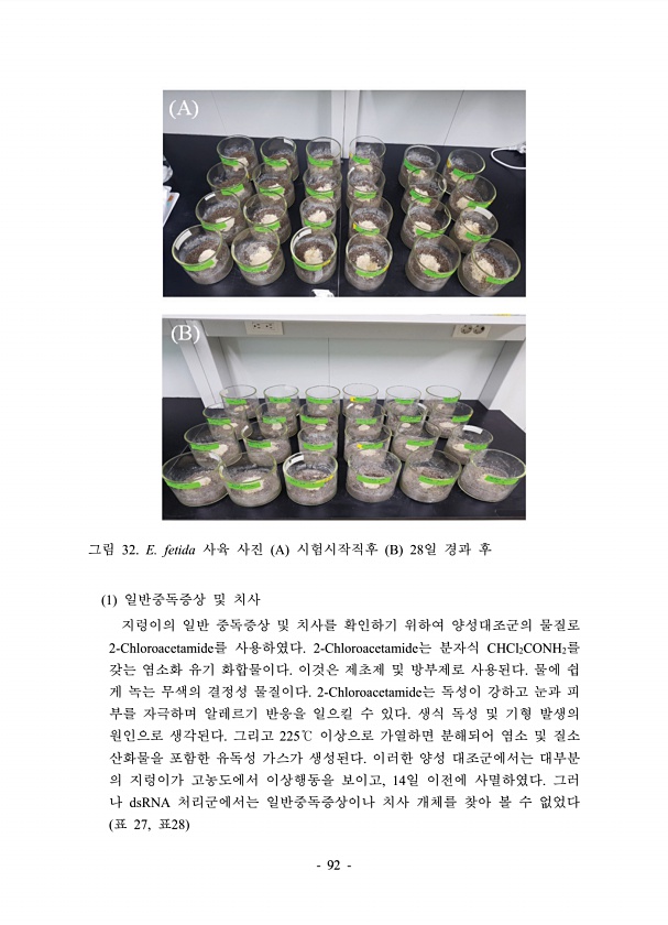 92 그림 32. E. fetida 사육 사진 A 시험시작직후 B 28일 경과 후 1 일반중독증상 및 치사 지렁이의 일반 중독증상 및 치사를 확인하기 위하여 양성대조군의 물질로 2-Chloroacetamide를 사용하였다. 2-Chloroacetamide는 분자식 CHCl2CONH2를 갖는 염소화 유기 화합물이다. 이것은 제초제 및 방부제로 사용된다. 물에 쉽 게 녹는 무색의 결정성 물질이다. 2-Chloroacetamide는 독성이 강하고 눈과 피 부를 자극하며 알레르기 반응을 일으킬 수 있다. 생식 독성 및 기형 발생의 원인으로 생각된다. 그리고 225℃ 이상으로 가열하면 분해되어 염소 및 질소 산화물을 포함한 유독성 가스가 생성된다. 이러한 양성 대조군에서는 대부분 의 지렁이가 고농도에서 이상행동을 보...