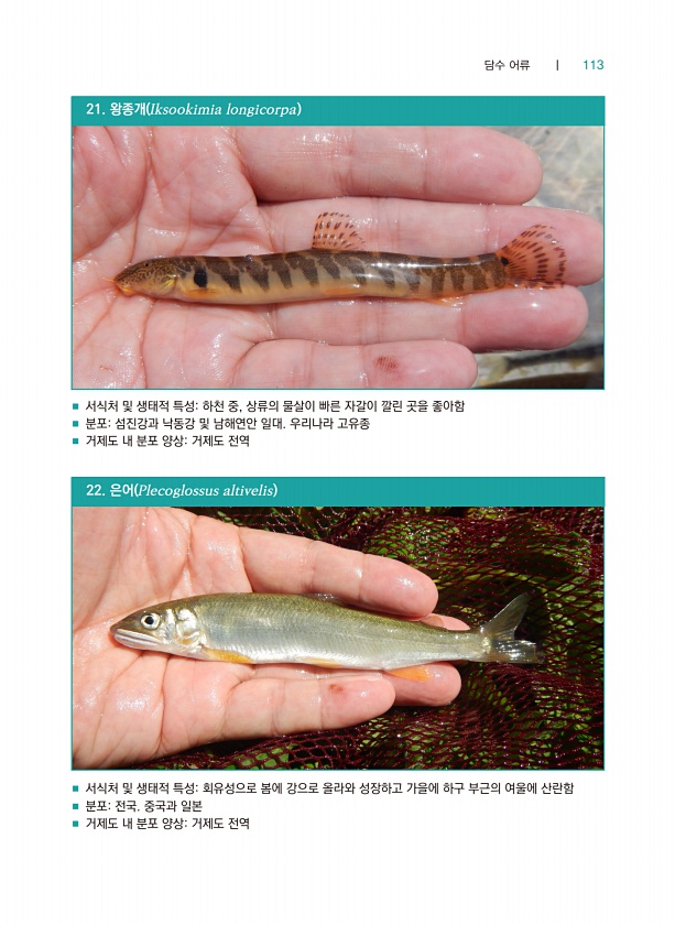 담수 어류 ┃ 113 ■ 서식처 및 생태적 특성하천 중, 상류의 물살이 빠른 자갈이 깔린 곳을 좋아함 ■ 분포섬진강과 낙동강 및 남해연안 일대. 우리나라 고유종 ■ 거제도 내 분포 양상거제도 전역 ■ 서식처 및 생태적 특성회유성으로 봄에 강으로 올라와 성장하고 가을에 하구 부근의 여울에 산란함 ■ 분포전국. 중국과 일본 ■ 거제도 내 분포 양상거제도 전역 21. 왕종개 Iksookimia longicorpa 22. 은어 Plecoglossus altivelis