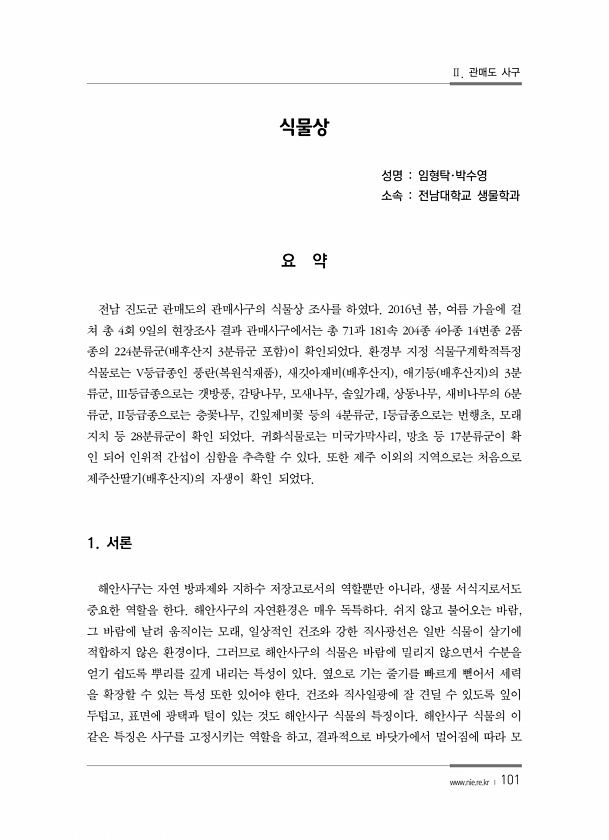 Ⅱ. 관매도 사구 www.nie.re.kr ? 101 식물상 성명 임형탁·박수영 소속 전남대학교 생물학과 요 약 전남 진도군 관매도의 관매사구의 식물상 조사를 하였다. 2016년 봄, 여름 가을에 걸 쳐 총 4회 9일의 현장조사 결과 관매사구에서는 총 71과 181속 204종 4아종 14변종 2품 종의 224분류군 배후산지 3분류군 포함 이 확인되었다. 환경부 지정 식물구계학적특정 식물로는 V등급종인 풍란 복원식재품 , 새깃아재비 배후산지 , 애기등 배후산지 의 3분 류군, III등급종으로는 갯방풍, 감탕나무, 모새나무, 솔잎가래, 상동나무, 새비나무의 6분 류군, II등급종으로는 층꽃나무, 긴잎제비꽃 등의 4분류군, I등급종으로는 번행초, 모래 지치 등 28분류군이 확인 되었다. 귀화식물로는 미국가막사리,...