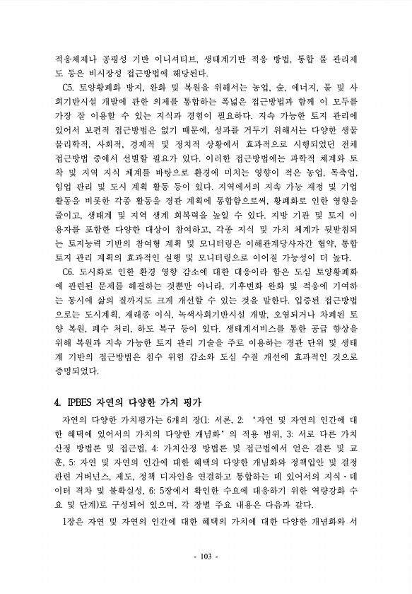 적응체제나 공평성 기반 이니셔티브, 생태계기반 적응 방법, 통합 물 관리제 도 등은 비시장성 접근방법에 해당된다. C5. 토양황폐화 방지, 완화 및 복원을 위해서는 농업, 숲, 에너지, 물 및 사 회기반시설 개발에 관한 의제를 통합하는 폭넓은 접근방법과 함께 이 모두를 가장 잘 이용할 수 있는 지식과 경험이 필요하다. 지속 가능한 토지 관리에 있어서 보편적 접근방법은 없기 때문에, 성과를 거두기 위해서는 다양한 생물 물리학적, 사회적, 경제적 및 정치적 상황에서 효과적으로 시행되었던 전체 접근방법 중에서 선별할 필요가 있다. 이러한 접근방법에는 과학적 체계와 토 착 및 지역 지식 체계를 바탕으로 환경에 미치는 영향이 적은 농업, 목축업, 임업 관리 및 도시 계획 활동 등이 있다. 지역에서의 지속 가능 재정 ...