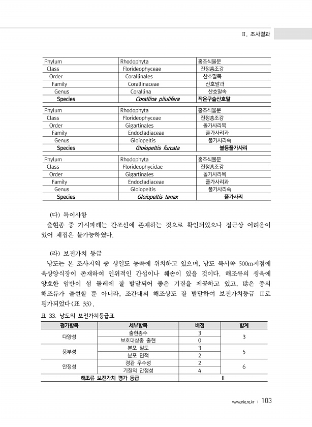 Ⅱ. 조사결과 www.nie.re.kr ? 103 Phylum Rhodophyta 홍조식물문 Class Florideophyceae 진정홍조강 Order Corallinales 산호말목 Family Corallinaceae 산호말과 Genus Corallina 산호말속 Species Corallina pilulifera 작은구슬산호말 Phylum Rhodophyta 홍조식물문 Class Florideophyceae 진정홍조강 Order Gigartinales 돌가사리목 Family Endocladiaceae 풀가사리과 Genus Gloiopeltis 풀가시리속 Species Gloiopeltis furcata 불등풀가사리 Phylum Rhodophyta 홍조식물문 Class Florideophycidae 진...