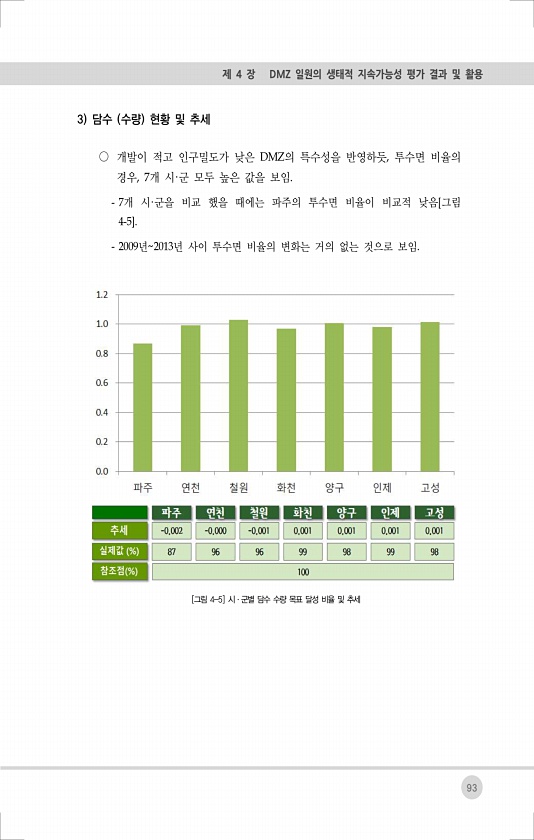 93 제 4 장 DMZ 일원의 생태적 지속가능성 평가 결과 및 활용 3 담수 수량 현황 및 추세 ○ 개발이 적고 인구밀도가 낮은 DMZ의 특수성을 반영하듯, 투수면 비율의 경우, 7개 시·군 모두 높은 값을 보임. 7개 시·군을 비교 했을 때에는 파주의 투수면 비율이 비교적 낮음[그림 4-5]. 2009년2013년 사이 투수면 비율의 변화는 거의 없는 것으로 보임. [그림 4-5] 시·군별 담수 수량 목표 달성 비율 및추세
