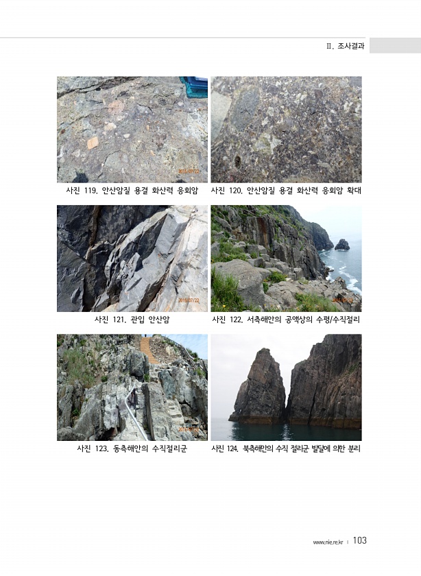 Ⅱ. 조사결과 www.nie.re.kr ? 103 사진 119. 안산암질 용결 화산력 응회암 사진 120. 안산암질 용결 화산력 응회암 확대 사진 121. 관입 안산암 사진 122. 서측해안의 공액상의 수평/수직절리 사진 123. 동측해안의 수직절리군 사진 124. 북측해안의 수직 절리군 발달에 의한분리