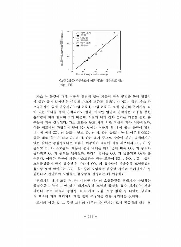 343 그림 2-5-2 증산속도에 따른 NO2의 흡수속도 名取? ?塚, 1980 가스 상 물질에 대해 식물은 엽면에 있는 기공의 작은 구멍을 통해 광합성 과 증산 등이 일어난다. 이렇게 가스가 교환될 때 SO₂나 NO₂ 등의 가스 상 오염물질이 잎에 흡수된다 그림 2-5-1, 그림 2-5-2 또한 엽면의 돌기처럼 되 어 있는 큐티클 층에 흡착되기도 한다. 하지만 엽면의 흡착량은 기공을 통한 흡수량에 비해 현저히 작기 때문에, 식물의 대기 정화 능력은 기공을 통한 흡 수능에 의해 산정된다. 가스 교환은 농도 차에 의한 확산에 따라 이루어진다. 식물 세포에서 광합성이 일어나는 낮에는 식물의 엽 내에 있는 공극이 밖의 대기에 비해 CO₂의 농도는 낮고, O₂와 H₂O의 농도는 높다. 때문에 CO2는 공극 내로 흡...