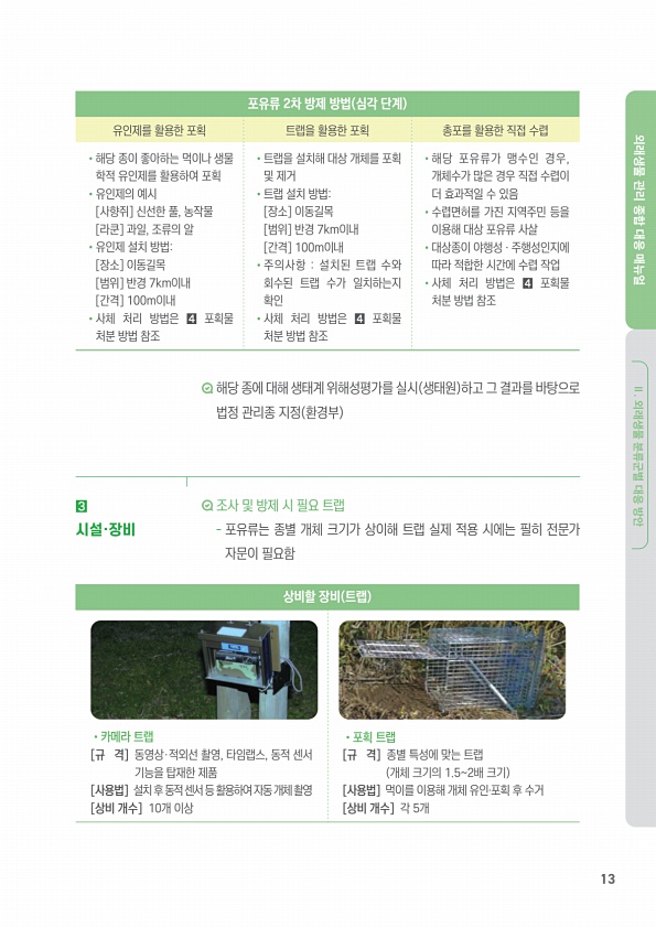 13 외래생물 관리 종합 대응 매뉴얼 Ⅱ. 외래생물 분류군별 대응 방안 포유류 2차 방제 방법 심각 단계 유인제를 활용한 포획 트랩을 활용한 포획 총포를 활용한 직접 수렵 ?해당 종이 좋아하는 먹이나 생물 학적 유인제를 활용하여 포획 ?유인제의 예시 [사향쥐] 신선한 풀, 농작물 [라쿤] 과일, 조류의 알 ?유인제 설치 방법[장소] 이동길목 [범위] 반경 7km이내 [간격] 100m이내 ?사체 처리 방법은 ? 포획물 처분 방법 참조 ?트랩을 설치해 대상 개체를 포획 및 제거 ?트랩 설치 방법[장소] 이동길목 [범위] 반경 7km이내 [간격] 100m이내 ?주의사항 설치된 트랩 수와 회수된 트랩 수가 일치하는지 확인 ?사체 처리 방법은 ? 포획물 처분 방법 참조 ?해당 포유류가 맹수인 경우, 개체수가 많은 경...