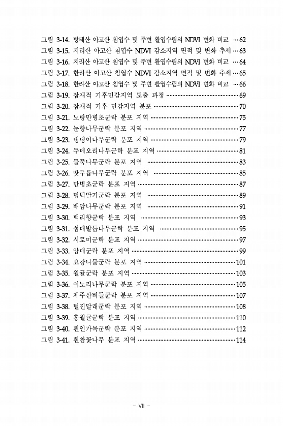 VII 그림 방태산 아고산 침엽수 및 주변 활엽수림의 변화 비교 그림 지리산 아고산 침엽수 감소지역 면적 및 변화 추세 그림 지리산 아고산 침엽수 및 주변 활엽수림의 변화 비교 그림 한라산 아고산 침엽수 감소지역 면적 및 변화 추세 그림 한라산 아고산 침엽수 및 주변 활엽수림의 변화 비교 그림 잠재적 기후민감지역 도출 과정 그림 잠재적 기후 민감지역 분포 그림 노랑만병초군락 분포 지역 그림 눈향나무군락 분포 지역 그림 댕댕이나무군락 분포 지역 그림 두메오리나무군락 분포 지역 그림 들쭉나무군락 분포 지역 그림 땃두릅나무군락 분포 지역 그림 만병초군락 분포 지역 그림 멍덕딸기군락 분포 지역 그림 배암나무군락 분포 지역 그림 백리향군락 분포 지역 그림 섬매발톱나무군락 분포 지역 그림 시로미군락 분포 지역 그림 암...