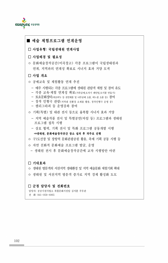 102 ■ 예술 체험프로그램 연계운영 □ 사업유형국립생태원 연계사업 □ 사업배경 및 필요성 ㅇ 문화예술창작공간 미곡창고 각종 프로그램이 국립생태원과 연계, 지역과의 연계성 확보로 시너지 효과 거양 모색 □ 사업 개요 ㅇ 공예교육 및 체험활동 연계 추진 매주 시행되는 각종 프로그램에 생태원 관람객 체험 및 참여 유도 각종 교육·체험 연계성 확보 가죽공예,도자기 페인팅,모시꽃 만들기 토요문화장터 허브비누 등 천연제품 및 나무공예 소품, 바느질 소품 등 참여 창작 인형극 관람 지역내 친환경 소재를 활용, 창작인형극 운영 중 캘리그라피 등 운영강좌 참여 ㅇ 기획 특별 및 대관 전시 등으로 융복합 시너지 효과 거양 지역 예술작품 전시 및 특별공연 마임 등 프로그램과 생태원 프로그램 접목 시행 상호 협력, 기획 전시 ...