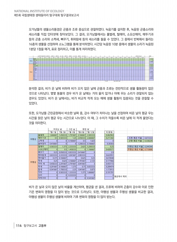 114 탐구보고서 고등부 제5회 국립생태원 생태동아리 탐구대회 탐구결과보고서 오가낭뜰의 생물소리풍경은 곤충과 조류 중심으로 관찰하였다. 녹음기를 설치한 후, 녹음된 곤충소리와 새소리를 직접 인터넷에 찾아보았다. 그 결과, 오가낭뜰에서는 풀벌레, 털매미, 소요산매미, 메뚜기과 등의 곤충 소리와 소쩍새, 뻐꾸기, 휘파람새 등의 새소리를 들을 수 있었다. 그 중에서 반복해서 들리는 16종의 생물을 선정하여 소노그램을 통해 분석하였다. 시간당 녹음된 10분 중에서 생물의 소리가 녹음된 1분당 1점을 매겨, 표로 정리하고, 이를 통계 처리하였다. 분석한 결과, 비가 온 날에 비하여 비가 오지 않은 날에 곤충과 조류는 전반적으로 생물 활동량이 많은 것으로 나타났다. 몇몇 동물의 경우 비가 온 날에는 거의 울지 않거나 ...