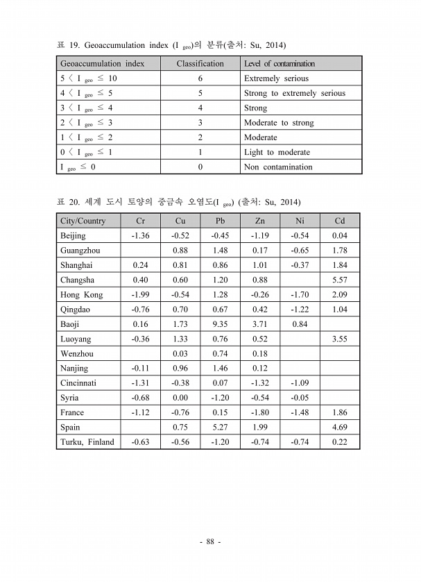 88 Geoaccumulation index Classification Level of contamination 5 I geo 10 6 Extremely serious 4 I geo 5 5 Strong to extremely serious 3 I geo 4 4 Strong 2 I geo 3 3 Moderate to strong 1 I geo 2 2 Moderate 0 I geo 1 1 Light to moderate I geo 0 0 Non contamination 19. Geoaccumulation index I geo Su, 2014 City/Country Cr Cu Pb Zn Ni Cd Beijing -1.36 -0.52 -0.45 -1.19 -0.54 0.04 Guangzhou 0.88 1.48 0....