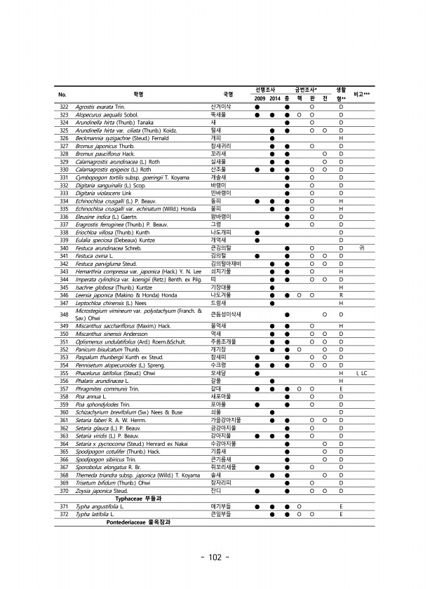 102 No. 학명 국명 선행조사 금번조사* 생활 2009 2014 총 핵 완 전 형** 비고*** 322 Agrostis exarata Trin. 산겨이삭 ● ● O D 323 Alopecurus aequalis Sobol. 뚝새풀 ● ● ● O O D 324 Arundinella hirta Thunb. Tanaka 새 ● O D 325 Arundinella hirta var. ciliata Thunb. Koidz. 털새 ● ● O O D 326 Beckmannia syzigachne Steud. Fernald 개피 ● H 327 Bromus japonicus Thunb. 참새귀리 ● ● O D 328 Bromus pauciflorus Hack. 꼬리새 ● ● O D 329 Calamagrostis aru...
