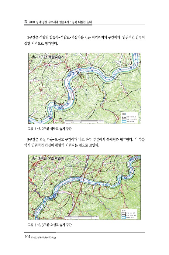 2018 생태·경관 우수지역 발굴조사 경북 내성천 일대 104 ? National Institute of Ecology 2구간은 석탑천 합류부-석탑교-멱실마을 인근 지역까지의 구간이다. 인위적인 간섭이 심한 지역으로 평가된다. 그림 ⅰ-5. 2구간 석탑교 습지 구간 3구간은 멱실 마을-오신교 구간이며 바로 하류 부분에서 옥계천과 합류한다. 이 부분 역시 인위적인 간섭이 활발히 이뤄지는 것으로 보인다. 그림 ⅰ-6. 3구간 오신교 습지구간