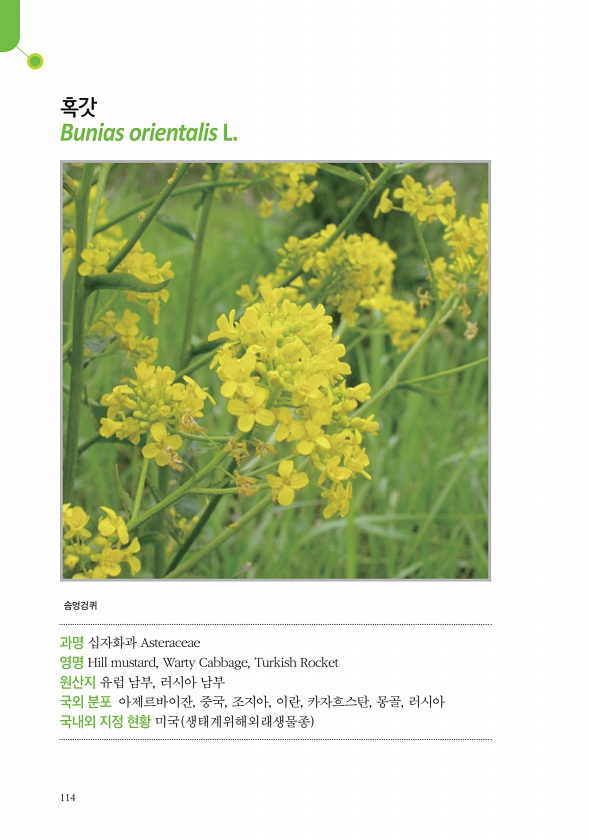 114 혹갓 Bunias orientalis L. 과명 십자화과 Asteraceae 영명 Hill mustard, Warty Cabbage, Turkish Rocket 원산지 유럽 남부, 러시아 남부 국외 분포 아제르바이잔, 중국, 조지아, 이란, 카자흐스탄, 몽골, 러시아 국내외 지정 현황 미국 생태계위해외래생물종솜엉겅퀴