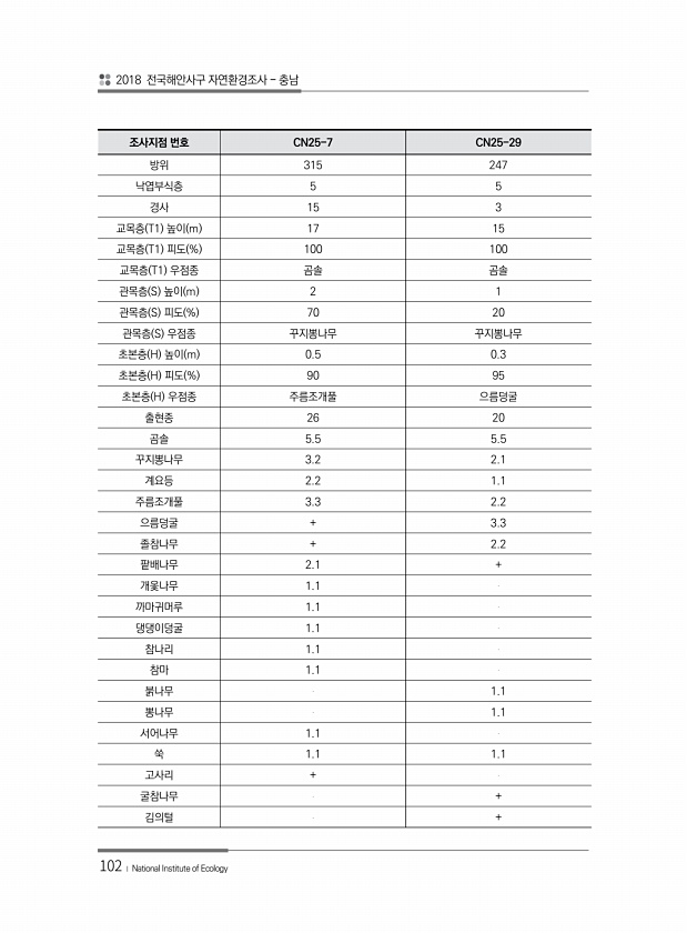 2018 전국해안사구 자연환경조사 충남 102 ? National Institute of Ecology 조사지점 번호 CN25-7 CN25-29 방위 315 247 낙엽부식층 5 5 경사 15 3 교목층 T1 높이 m 17 15 교목층 T1 피도 % 100 100 교목층 T1 우점종 곰솔 곰솔 관목층 S 높이 m 2 1 관목층 S 피도 % 70 20 관목층 S 우점종 꾸지뽕나무 꾸지뽕나무 초본층 H 높이 m 0.5 0.3 초본층 H 피도 % 90 95 초본층 H 우점종 주름조개풀 으름덩굴 출현종 26 20 곰솔 5.5 5.5 꾸지뽕나무 3.2 2.1 계요등 2.2 1.1 주름조개풀 3.3 2.2 으름덩굴 + 3.3 졸참나무 + 2.2 팥배나무 2.1 + 개옻나무 1.1 까마귀머루 1.1 댕댕이덩굴 1...