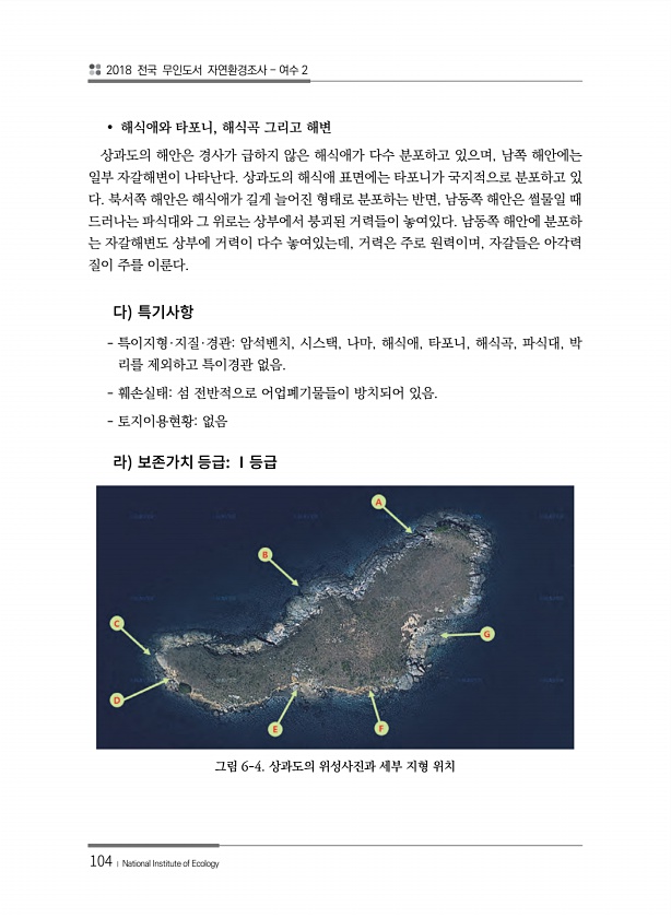 2018 전국 무인도서 자연환경조사 여수 2 104 ? National Institute of Ecology ? 해식애와 타포니, 해식곡 그리고 해변 상과도의 해안은 경사가 급하지 않은 해식애가 다수 분포하고 있으며, 남쪽 해안에는 일부 자갈해변이 나타난다. 상과도의 해식애 표면에는 타포니가 국지적으로 분포하고 있 다. 북서쪽 해안은 해식애가 길게 늘어진 형태로 분포하는 반면, 남동쪽 해안은 썰물일 때 드러나는 파식대와 그 위로는 상부에서 붕괴된 거력들이 놓여있다. 남동쪽 해안에 분포하 는 자갈해변도 상부에 거력이 다수 놓여있는데, 거력은 주로 원력이며, 자갈들은 아각력 질이 주를 이룬다. 특이지형·지질·경관암석벤치, 시스택, 나마, 해식애, 타포니, 해식곡, 파식대, 박 리를 제외하고 특이경관 없음. 훼손...