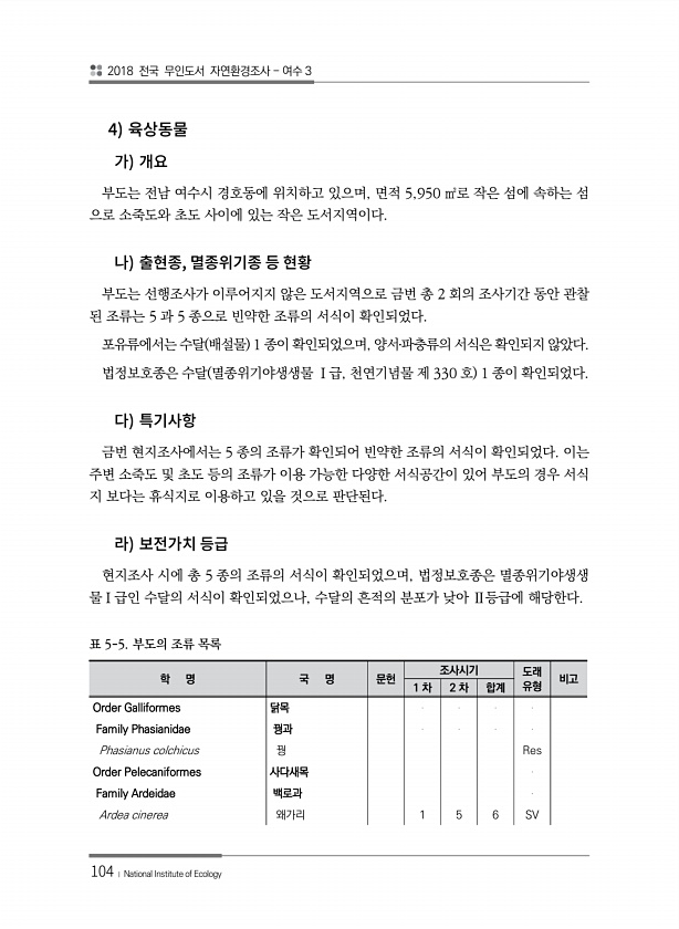 2018 전국 무인도서 자연환경조사 여수 3 104 ? National Institute of Ecology 4 부도는 전남 여수시 경호동에 위치하고 있으며, 면적 5,950 ㎡로 작은 섬에 속하는 섬 으로 소죽도와 초도 사이에 있는 작은 도서지역이다. , 부도는 선행조사가 이루어지지 않은 도서지역으로 금번 총 2 회의 조사기간 동안 관찰 된 조류는 5 과 5 종으로 빈약한 조류의 서식이 확인되었다. 포유류에서는 수달 배설물 1 종이 확인되었으며, 양서?파충류의 서식은 확인되지 않았다. 법정보호종은 수달 멸종위기야생생물 Ⅰ급, 천연기념물 제 330 호 1 종이 확인되었다. 금번 현지조사에서는 5 종의 조류가 확인되어 빈약한 조류의 서식이 확인되었다. 이는 주변 소죽도 및 초도 등의 조류가 이용 가능한 다양한...