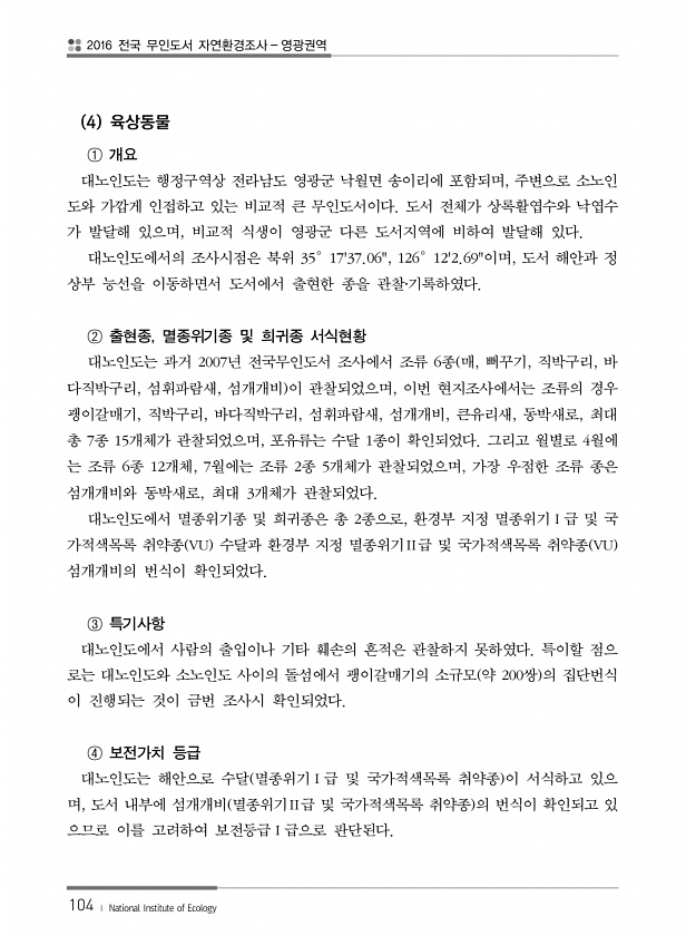 2016 전국 무인도서 자연환경조사 영광권역 104 ? National Institute of Ecology 4 육상동물 ① 개요 대노인도는 행정구역상 전라남도 영광군 낙월면 송이리에 포함되며, 주변으로 소노인 도와 가깝게 인접하고 있는 비교적 큰 무인도서이다. 도서 전체가 상록활엽수와 낙엽수 가 발달해 있으며, 비교적 식생이 영광군 다른 도서지역에 비하여 발달해 있다. 대노인도에서의 조사시점은 북위 35°1737.06, 126°122.69이며, 도서 해안과 정 상부 능선을 이동하면서 도서에서 출현한 종을 관찰?기록하였다. ② 출현종, 멸종위기종 및 희귀종 서식현황 대노인도는 과거 2007년 전국무인도서 조사에서 조류 6종 매, 뻐꾸기, 직박구리, 바 다직박구리, 섬휘파람새, 섬개개비 이 관찰되었으며, 이번...