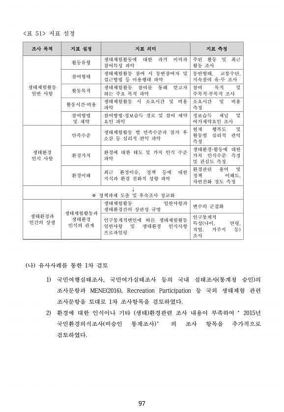 97 표 51 지표 설정 조사 목적 지표 설정 지표 의미 지표 측정 생태체험활동 일반 사항 활동유형 생태체험활동에 대한 과거 이력과 참여특성 파악 주된 활동 및 최근 활동 조사 참여형태 생태체험활동 참여 시 동반참여자 및 접근방법 등 이용행태 파악 동반형태, 교통수단, 지속참여 유·무 조사 활동목적 생태체험활동 참여를 통해 얻고자 하는 주요 목적 파악 참여 목적 및 주목적·부목적 조사 활동시간·비용 생태체험활동 시 소요시간 및 비용 파악 소요시간 및 비용 측정 참여방법 및 제약 참여방법·정보습득 경로 및 참여 제약 요인 파악 정보습득 채널 및 여가제약요인 조사 생태환경 인식 사항 만족수준 생태체험활동 별 만족수준과 참가 후 소감 등 심리적 편익 파악 현재 행복도 및 활동별 심리적 편익 측정 환경가치 환경에 ...