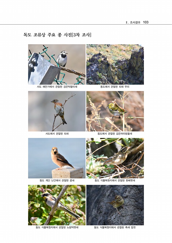 Ⅱ. 조사결과 103 독도 조류상 주요 종 사진[3차 조사] 서도 해안가에서 관찰된 검은턱할미새 동도에서 관찰된 되새 무리 서도에서 관찰된 되새 동도에서 관찰된 검은머리방울새 동도 계단 난간에서 관찰된 콩새 동도 식물복원지에서 관찰된 흰배멧새 동도 식물복원지에서 관찰된 노랑턱멧새 동도 식물복원지에서 관찰된 촉새암컷