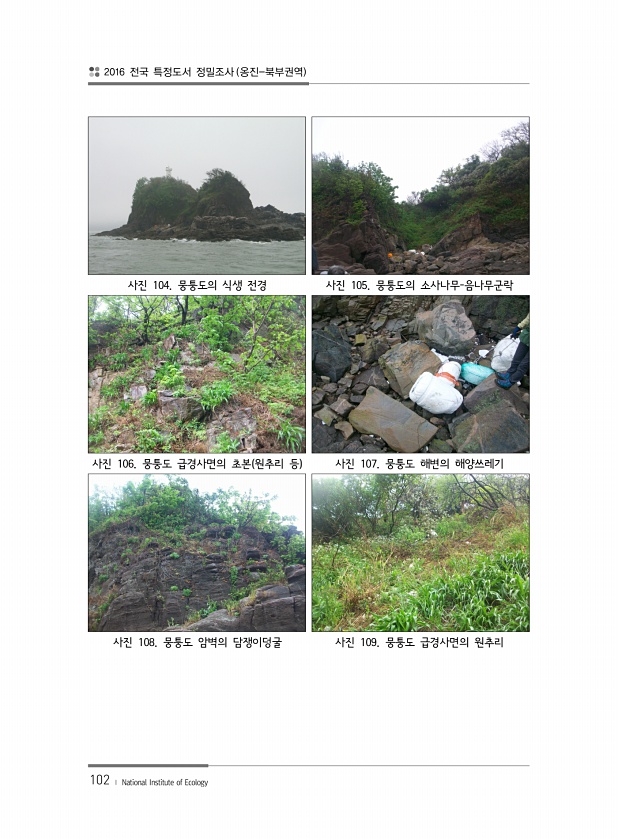 2016 전국 특정도서 정밀조사 옹진-북부권역 102 ? National Institute of Ecology 사진 104. 뭉퉁도의 식생 전경 사진 105. 뭉퉁도의 소사나무-음나무군락 사진 106. 뭉퉁도 급경사면의 초본 원추리 등 사진 107. 뭉퉁도 해변의 해양쓰레기 사진 108. 뭉퉁도 암벽의 담쟁이덩굴 사진 109. 뭉퉁도 급경사면의원추리