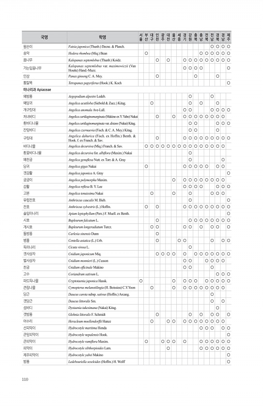 110 팔손이 Fatsia japonica Thunb. Decne. & Planch. ○ ○ ○ ○ 송악 Hedera rhombea Miq. Bean ○ ○ ○ ○ ○ ○ ○ 음나무 Kalopanax septemlobus Thunb. Koidz. ○ ○ ○ ○ ○ ○ ○ ○ ○ ○ ○ 가는잎음나무 Kalopanax septemlobus var. maximowiczii Van Houtte Hand.-Mazz. ○ ○ ○ ○ ○ 인삼 Panax ginseng C. A. Mey. ○ ○ ○ 통탈목 Tetrapanax papyriferus Hook. K. Koch ○ 미나리과 Apiaceae 왜방풍 Aegopodium alpestre Ledeb. ○ ○ 왜당귀 Angelica acutiloba Siebold & Z...