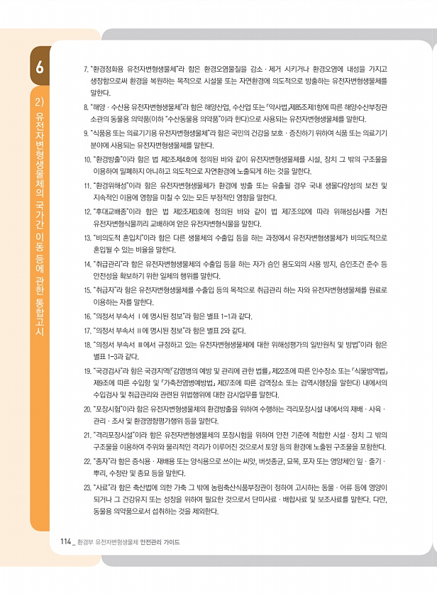114 _ 환경부 유전자변형생물체 안전관리 가이드 6 유전자변형생물체의 국가간 이동 등에 관한 통합고시 2 7. “환경정화용 유전자변형생물체”라 함은 환경오염물질을 감소·제거 시키거나 환경오염에 내성을 가지고 생장함으로써 환경을 복원하는 목적으로 시설물 또는 자연환경에 의도적으로 방출하는 유전자변형생물체를 말한다. 8. “해양·수산용 유전자변형생물체”라 함은 해양산업, 수산업 또는 「약사법」제85조제1항에 따른 해양수산부장관 소관의 동물용 의약품 이하 “수산동물용 의약품”이라 한다 으로 사용되는 유전자변형생물체를 말한다. 9. “식품용 또는 의료기기용 유전자변형생물체”라 함은 국민의 건강을 보호·증진하기 위하여 식품 또는 의료기기 분야에 사용되는 유전자변형생물체를 말한다. 10. “환경방출”이라 함은 법 제...