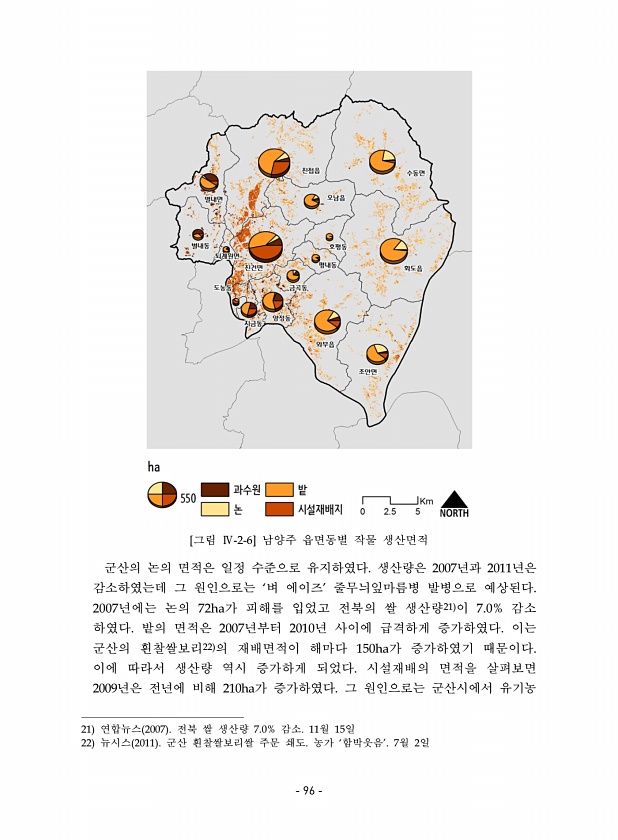 [그림 Ⅳ-2-6] 남양주 읍면동별 작물 생산면적 군산의 논의 면적은 일정 수준으로 유지하였다. 생산량은 2007년과 2011년은 감소하였는데 그 원인으로는 ‘벼 에이즈’ 줄무늬잎마름병 발병으로 예상된다. 2007년에는 논의 72ha가 피해를 입었고 전북의 쌀 생산량21 이 7.0% 감소 하였다. 밭의 면적은 2007년부터 2010년 사이에 급격하게 증가하였다. 이는 군산의 흰찰쌀보리22 의 재배면적이 해마다 150ha가 증가하였기 때문이다. 이에 따라서 생산량 역시 증가하게 되었다. 시설재배의 면적을 살펴보면 2009년은 전년에 비해 210ha가 증가하였다. 그 원인으로는 군산시에서 유기농 21 연합뉴스 2007 전북 쌀 생산량 7.0% 감소. 11월 15일 22 뉴시스 2011 군산 흰찰쌀보리쌀 주문 쇄...