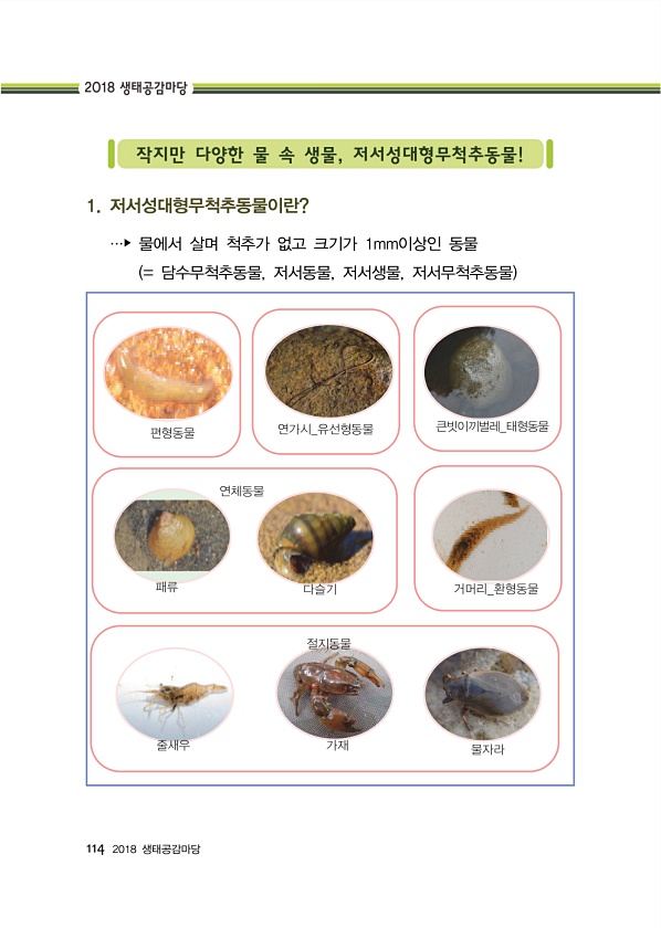 114 2018 생태공감마당 작지만 다양한 물 속 생물, 저서성대형무척추동물! 1. 저서성대형무척추동물이란? …? 물에서 살며 척추가 없고 크기가 1mm이상인 동물 = 담수무척추동물, 저서동물, 저서생물, 저서무척추동물 연가시_유선형동물 큰빗이끼벌레_태형동물 패류 연체동물 다슬기 거머리_환형동물 줄새우 절지동물 가재 물자라편형동물