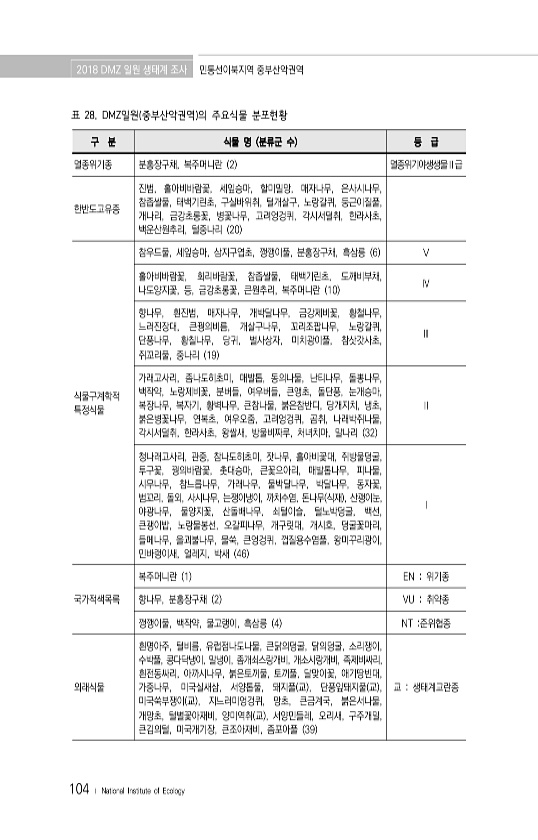 2018 DMZ 일원 생태계 조사 민통선이북지역 중부산악권역 104 ? National Institute of Ecology 표 28. DMZ일원 중부산악권역 의 주요식물 분포현황 구 분 식물 명 분류군 수 등 급 멸종위기종 분홍장구채, 복주머니란 2 멸종위기야생생물Ⅱ급 한반도고유종 진범, 홀아비바람꽃, 세잎승마, 할미밀망, 매자나무, 은사시나무, 참좁쌀풀, 태백기린초, 구실바위취, 털개살구, 노랑갈퀴, 둥근이질풀, 개나리, 금강초롱꽃, 병꽃나무, 고려엉겅퀴, 각시서덜취, 한라사초, 백운산원추리, 털중나리 20 식물구계학적 특정식물 참우드풀, 세잎승마, 삼지구엽초, 깽깽이풀, 분홍장구채, 흑삼릉 6 Ⅴ 홀아비바람꽃, 회리바람꽃, 참좁쌀풀, 태백기린초, 도깨비부채, 나도양지꽃, 등, 금강초롱꽃, 큰원추리, 복...