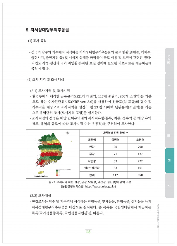 115 제5차 전국자연환경조사 지침 8. 저서성대형무척추동물 1 조사?목적 전국의?담수와?기수에서?서식하는?저서성대형무척추동물의?분포?현황 출현종, 개체수, 출현시기, 출현지점?등 및?서식지?상태를?파악하여?국토?이용?및?보전에?관련된?생태· 자연도?작성·갱신과?국가?자연환경·자원?보전?정책에?필요한?기초자료를?제공하는데 목적이?있다. 2 조사?지역?및?조사?대상 ?.? 조사지역?및?조사지점 환경부에서?제작한?공통유역도 ??개?대권역, ???개?중권역, ???개?소권역 를?기본 으로?하는?수자원단위지도 KRF ver. ?.? 를?사용하여?전국토 섬?포함 의?담수?및 기수역을?대상으로?조사지역을?설정 그림 ?? 참조 하여?단위유역 소권역 을?기준 으로?유역단위?조사 도서지역?포함 를?실시한다. 조사지점의?선정...