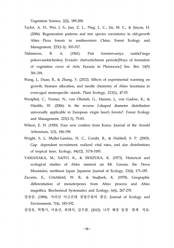 98 Vegetation Science, 2 2 , 189-200. Taylor, A. H., Wei, J. S., Jun, Z. L., Ping, L. C., Jin, M. C., & Jinyan, H. 2006 Regeneration patterns and tree species coexistence in old-growth Abies?Picea forests in southwestern China. Forest Ecology and Management, 223 1-3 , 303-317. Ti;hmirow, B. A. 1961 Puti formirovaniya rastitel’?iiv chetvertichnom periode!Ways of formation of vegetation cover of Art...