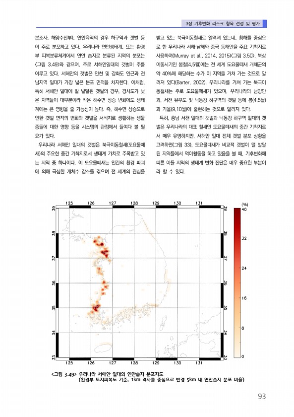 3장 기후변화 리스크 항목 선정 및 평가 93 본조사, 해양수산부 , 연안육역의 경우 하구역과 갯벌 등 이 주로 분포하고 있다. 우리나라 연안생태계, 또는 환경 부 피복분류체계에서 연안 습지로 분류된 지역의 분포는 그림 3.49 와 같으며, 주로 서해안일대의 갯벌이 주를 이루고 있다. 서해안의 갯벌은 인천 및 강화도 인근과 전 남지역 일대가 가장 넓은 분포 면적을 차지한다. 이처럼, 특히 서해안 일대에 잘 발달된 갯벌의 경우, 경사도가 낮 은 지역들이 대부분이라 작은 해수면 상승 변화에도 생태 계에는 큰 영향을 줄 가능성이 높다. 즉, 해수면 상승으로 인한 갯벌 면적의 변화와 갯벌을 서식지로 생활하는 생물 종들에 대한 영향 등을 시스템의 관점에서 들여다 볼 필 요가 있다. 우리나라 서해안 일대의 갯벌은 북극...
