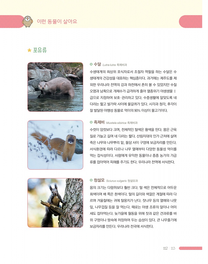112 113 포유류 청설모 Sciurus vulgaris 청설모과 몸의 크기는 다람쥐보다 훨씬 크다. 털 색은 전체적으로 어두운 회색이며 배 쪽은 흰색이다. 털의 길이와 색깔은 계절에 따라 다 르며 겨울철에는 귀에 털뭉치가 난다. 잣나무 등의 열매와 나뭇 잎, 나무껍질 등을 잘 먹는다. 때로는 야생 조류의 알이나 어미 새도 잡아먹는다. 늦가을에 월동을 위해 잣과 같은 견과류를 바 위 구멍이나 땅속에 저장하여 두는 습성이 있다. 큰 나무줄기에 보금자리를 만든다. 우리나라 전국에 서식한다. 수달 Lutra lutra 족제비과 수생태계의 최상위 포식자로서 조절자 역할을 하는 수달은 수 생태계의 건강성을 대표하는 핵심종이다. 과거에는 제주도를 제 외한 우리나라 전역의 강과 하천에서 흔히 볼 수 있었지만 수질 오염...