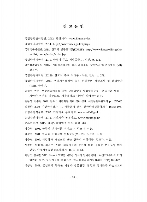 94 참 고 문 헌 국립공원관리공단. 2012. 환경기사. www.kknps.or.kr. 국립농업과학원. 2014. http//www.naas.go.kr/pisys. 국립생물자원관. 2014. 한국의 멸종위기종 KORED http//www.korearedlist.go.kr/ redlist/home/exlist/exlist.jsp. 국립환경과학원. 2010. 한국의 주요 외래동물Ⅱ, 인천. p. 134. 국립환경과학원. 2012a. 생태계위해성이 높은 외래종의 정밀조사 및 관리방안 VII 환경부. 국립환경과학원. 2012b. 한국의 주요 외래동?식물, 인천. p. 271. 국립환경과학원. 2013. 생태계위해성이 높은 외래종의 정밀조사 및 관리방안 VIII 환경부. 권혁수. 2011. 보호지역계획을 위한 생물...