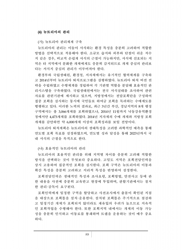 89 4 뉴트리아의 관리 가 뉴트리아 관리체계 구축 뉴트리아의 관리는 이들이 서식하는 환경 특성을 충분히 고려하여 적합한 방법을 선택적으로 적용해야 한다. 소규모 습지와 외부와 단절이 쉬운 저수 지 같은 경우, 비교적 손쉽게 서식의 근절이 가능하지만, 서식에 선호되는 지 역은 타 지역에서 분화한 개체에게도 충분히 감지되므로 개체 중심의 관리보 다는 서식지 중심의 관리가 이루어져야 한다. 환경부와 국립생태원, 환경청, 지자체에서는 유기적인 협력체계를 구축하 고 2014년부터 뉴트리아 퇴치프로그램을 실행하였다. 뉴트리아 퇴치 비전 전 략을 수립하였고 수행체계를 정립하여 각 기관별 역할을 분담해 효율적인 관 리시스템을 구축하였다. 국립생태원에서는 전국 서식실태를 조사하여 관련 자료를 관련기관에 제시하고 있으며, ...