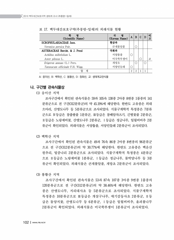 2016 백두대간보호지역 생태계 조사 추풍령밀재 102Ⅰwww.nie.re.kr 표 17. 백두대간보호구역 추풍령밀재 의 외래식물 현황 학 명 Scientific Name 국 명 Korean Name A B C D 비 고 SCROPHULARIACEAE Juss. 현삼과 Veronica persica Poir. 큰개불알풀 ○ ASTERACEAE Bercht. & J. Presl 국화과 Achillea millefolium L. 서양톱풀 ○ Aster pilosus L. 미국쑥부쟁이 ○ 교 Erigeron annuas L. Pers. 개망초 ○ ○ Taraxacum officinale F.H. Wigg. 서양민들레 ○ 합 계 2 2 1 1 A웅이산, B백학산, C봉황산, D청화산, 교생태계교란식물 나. 구간별 ...