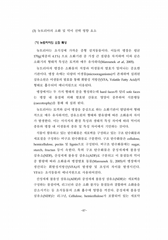 -87- 3 뉴트리아의 소화 및 먹이 선택 영향 요소 가 뉴트리아의 소화 특성 뉴트리아는 초식성에 가까운 중형 설치동물이다. 이들의 맹장은 평균 170g 체중의 4.1% 으로 소화기관 중 가장 큰 질량을 차지하며 이와 같은 소화기의 형태적 특성은 토끼와 매우 유사하다 Marounek et al., 2005 뉴트리아의 맹장은 소화물의 저장과 미생물의 발효가 일어나는 중요한 기관이다. 맹장 속에는 다량의 미생물 microoraganisms 이 존재하며 섭취된 섬유소원은 미생물의 발효를 통해 휘발성 지방산 VFA, Volatile Fatty Acid 의 형태로 흡수되어 에너지원으로 이용된다. 맹장에서는 두 가지 형태의 분을 형성하는데 hard faces와 달리 sofe faces 는 맹장 내 물질에 의해 발효된 ...
