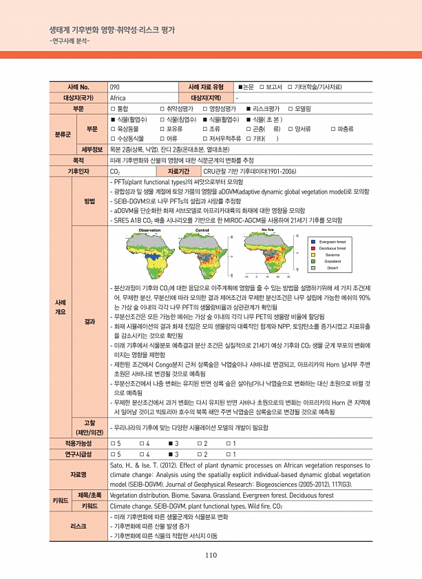 110 생태계 기후변화 영향·취약성·리스크 평가 -연구사례 분석- 사례 No. 090 사례 자료 유형 ■논문 □ 보고서 □ 기타 학술/기사자료 대상지 국가 Africa 대상지 지역 부문 □ 통합 □ 취약성평가 □ 영향성평가 ■ 리스크평가 □ 모델링 분류군 부문 ■ 식물 활엽수 □ 식물 침엽수 ■ 식물 활엽수 ■ 식물 초 본 □ 육상동물 □ 포유류 □ 조류 □ 곤충 류 □ 양서류 □ 파충류 □ 수상동식물 □ 어류 □ 저서무척추류 □ 기타 세부정보 목본 2종 상록, 낙엽 , 잔디 2종 온대초본, 열대초본 목적 미래 기후변화와 산불의 영향에 대한 식문군계의 변화를 추정 기후인자 CO2 자료기간 CRU관찰 기반 기후데이터 1901-2006 사례 개요 방법 PFTs plant functional types 의 씨앗으...