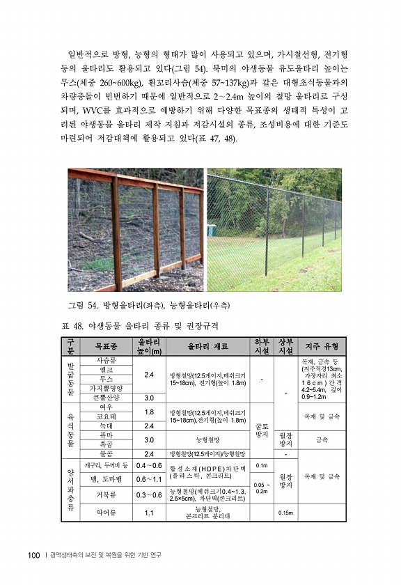 100 일반적으로 방형 능형의 형태가 많이 사용되고 있으며 가시철선형 전기형 등의 울타리도 활용되고 있다 그림 북미의 야생동물 유도울타리 높이는 무스 체중 흰꼬리사슴 체중 과 같은 대형초식동물과의 차량충돌이 빈번하기 때문에 일반적으로 높이의 철망 울타리로 구성 되며 를 효과적으로 예방하기 위해 다양한 목표종의 생태적 특성이 고 려된 야생동물 울타리 제작 지침과 저감시설의 종류 조성비용에 대한 기준도 마련되어 저감대책에 활용되고 있다 표 그림 54. 방형울타리 좌측 , 능형울타리 우측 구분 목표종 울타리 높이 m 울타리 재료 하 시부 설 상 시부 설 지주 유형 발굽동물 사슴류 2.4 방형철망 12.5게이지,메쉬크기 1518cm , 전기형 높이 1.8m 목재, 금속 등 지주직경13cm, 가장자리 최소 1 6 c...