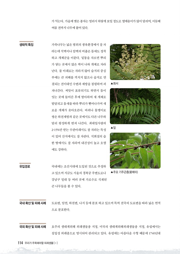 114 우리가 주목해야할 외래생물 [Ⅰ] 가 익는다. 가을에 맺은 종자는 멀리서 하얗게 보일 정도로 열매송이가 많이 달리며, 이듬해 여름 전까지 나무에 붙어 있다. 생태적 특징 가죽나무는 넓은 범위의 생육환경에서 잘 자 라는데 석벽이나 암벽의 비좁은 틈에도 정착 하고 개체군을 이룬다. 밑동을 자르면 뿌리 가 닿는 곳에서 많은 싹이 나와 개체로 자라 난다. 물 아래로는 자라지 않아 습지의 중심 부에는 큰 피해를 끼치지 않으나 습지로 연 결되는 전이대인 수변과 제방을 점령하며 퍼 져나간다. 씨앗이 표류되기도 하면서 틈이 잇는 곳에 들어간 후에 발아하여 새 개체로 발달되고 틈새를 따라 뿌리가 뻗어나가며 새 로운 개체가 솟아오른다. 바위나 돌멩이로 쌍은 하천제방과 같은 곳에서도 다른 나무와 달리 왕성하게 번져 나간...