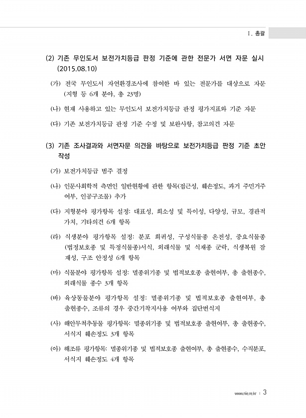 Ⅰ. 총괄 www.nie.re.kr ? 3 2 기존 무인도서 보전가치등급 판정 기준에 관한 전문가 서면 자문 실시 2015.08.10 가 전국 무인도서 자연환경조사에 참여한 바 있는 전문가를 대상으로 자문 지형 등 6개 분야, 총 23명 나 현재 사용하고 있는 무인도서 보전가치등급 판정 평가지표와 기준 자문 다 기존 보전가치등급 판정 기준 수정 및 보완사항, 참고의견 자문 3 기존 조사결과와 서면자문 의견을 바탕으로 보전가치등급 판정 기준 초안 작성 가 보전가치등급 범주 결정 나 인문사회학적 측면인 일반현황에 관한 항목 접근성, 훼손정도, 과거 주민거주 여부, 인공구조물 추가 다 지형분야 평가항목 설정대표성, 희소성 및 특이성, 다양성, 규모, 경관적 가치, 기타의견 6개 항목 라 식생분야 평가항목 설정분포...