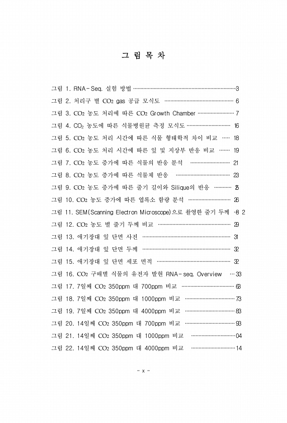 x 그 림 목 차 그림 1. RNA- Seq. 실험 방법 ·······································································3 그림 2. 처리구 별 CO2 gas 공급 모식도 ··············································· 6 그림 3. CO2 농도 처리에 따른 CO2 Growth Chamber ························· 7 그림 4. CO2 농도에 따른 식물병원균 측정 모식도 ······························ 16 그림 5. CO2 농도 처리 시간에 따른 식물 형태학적 차이 비교 ····· 18 그림 6. CO2 농도 처리 시간에 따른 잎 및 지상부 반응 비교 ····...