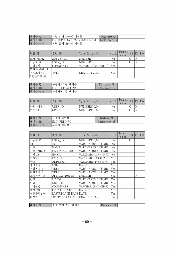 99 테이블 명 지형 조사 조사자 테이블 Database 명 테이블 ID ECOTOPOGRAPHYSURVEYUSERINFO Tablespace 명 테이블 설명 지형 조사 조사자 테이블 컬럼 명 컬럼 ID Type & Length NULL Default value PK FK IDX 조사자료PK SURVEY_ID NUMBER No O O 사용자PK USER_ID NUMBER No O O 기타설명 COMMENTS VARCHAR2 2000 CHAR Yes 조사자 종류 R전문조사자, I일반조사자 TYPE CHAR 1 BYTE Yes 테이블 명 사용자-그룹 테이블 Database 명 테이블 ID ECOUSERGROUPINFO Tablespace 명 테이블 설명 사용자-그룹 테이블 컬럼 명 컬럼 ID Type & Len...