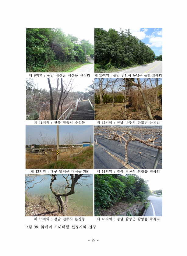 89 제 9지역 충남 예산군 예산읍 산성리 제 10지역 충남 천안시 동남구 동면 화계리 제 11지역 전북 정읍시 수성동 제 12지역 전남 나주시 산포면 산제리 제 13지역 대구 달서구 대천동 788 제 14지역 경북 경산시 진량읍 평사리 제 15지역 경남 진주시 본성동 제 16지역 경남 함양군 함양읍 죽곡리 그림 38. 꽃매미 모니터링 선정지역전경